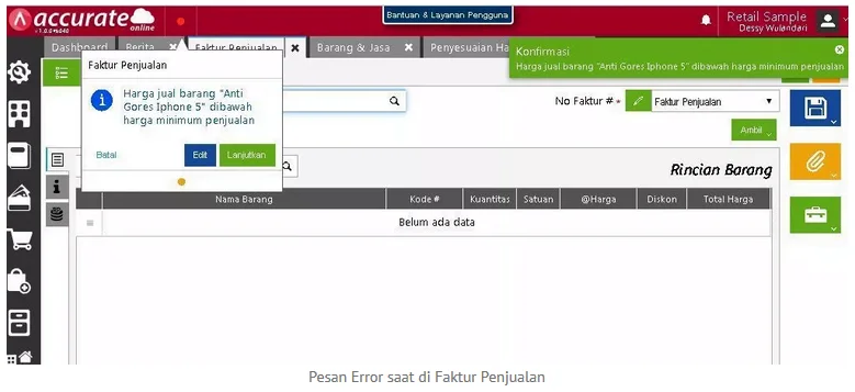 Hal ini dikarenakan, anda menginput nilai harga jual barang di Faktur Penjualan dibawah harga minimum yang ditetapkan atas barang tsb. Harga Minimum yang dimaksud adalah harga minimum yang diatur pada menu Penjualan | Penyesuaian Harga/Diskon. Dengan demikian, barang tersebut hanya bisa diinput dengan nilai harga jual diatas atau sama dengan Harga Minimumnya.