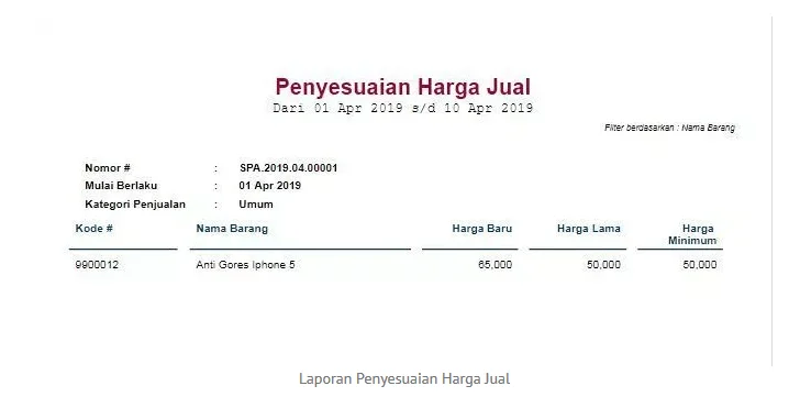 Anda bisa melakukan pengecekan harga minimum suatu barang dari Laporan Penyesuaian Harga Jual, yaitu melalui menu menu Laporan | Daftar Laporan | Penjualan, isikan dengan periode tanggal tertentu dan pilih nama barang yang dimaksud.