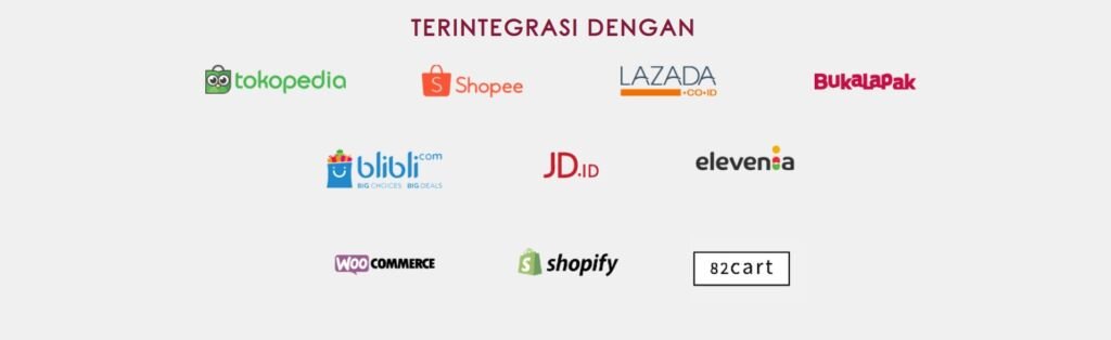 Secara official terintegrasi API dengan berbagai marketplace (Tokopedia, Shopee, Lazada, Blibli, JD.ID, Elevenia) dan website/ecommerce (82cart, Shopify).