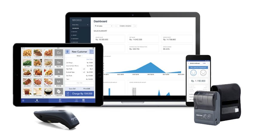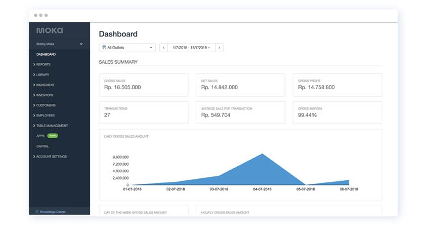 Dari back office Moka, Anda dapat melihat laporan penjualan dari beberapa outlet sekaligus, mengetahui stok inventaris, dan menerima masukan dari pelanggan. Moka juga menyediakan analisa sehingga Anda dapat mengetahui barang mana yang paling laku, stok mana yang sudah hampir habis, kapan waktu tersibuk Anda, dan lainnya.