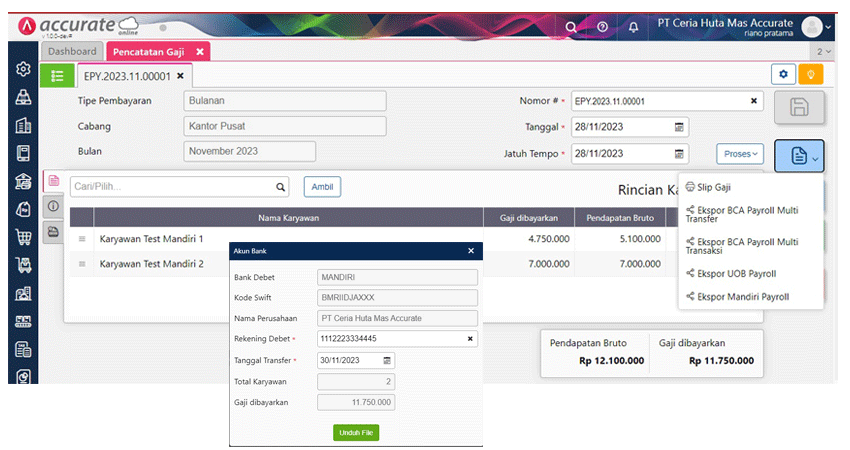 3. Buka daftar Pencatatan Gaji yang baru saja dibuat, klik tombol Cetak dan pilih Ekspor Mandiri Payroll.