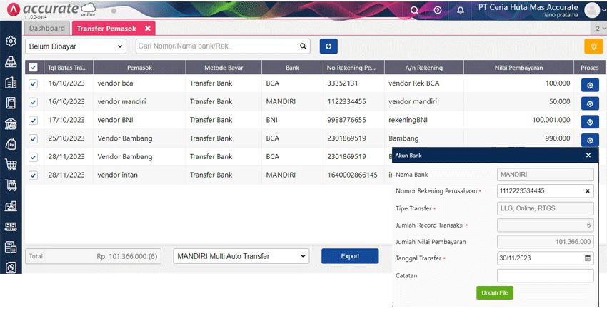 Jika sebelumnya Anda perlu menyiapkan file .csv lalu membuat file transfer sebelum dapat menggunakan layanan multi transfer dari bank Mandiri, kini Anda dapat memproses data transfer tersebut ke berbagai supplier di Accurate Online langsung menjadi file transfer.txt untuk diupload di Internet Banking Mandiri Bisnis Anda.