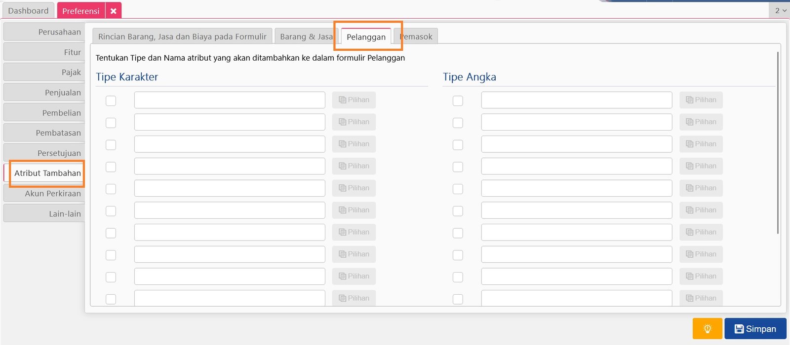 Aktifkan Atribut Tambahan Pelanggan yang ingin digunakan pada menu Preferensi | Atribut Tambahan kemudian isikan sesuai kebutuhan.