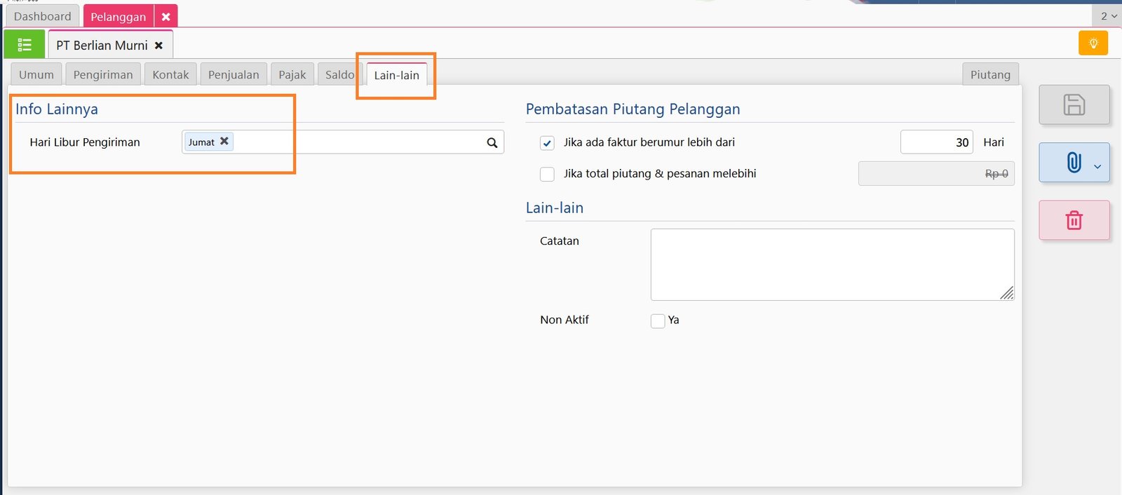 Isikan informasi terkait atribut tambahan tersebut pada data pelanggan yang bersangkutan melalui menu Penjualan | Pelanggan lalu ke tab Lain-lain.