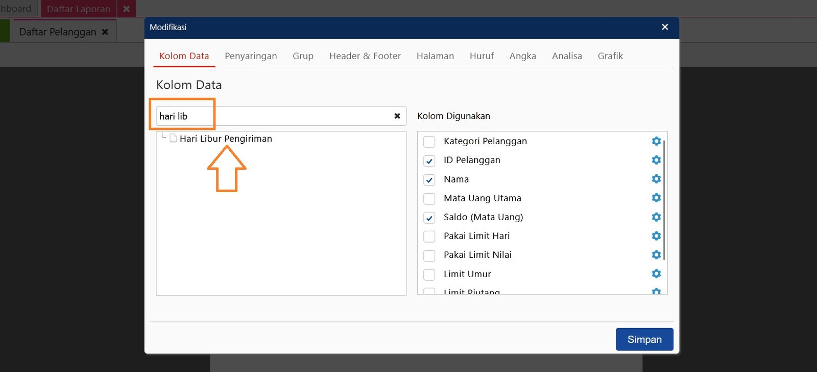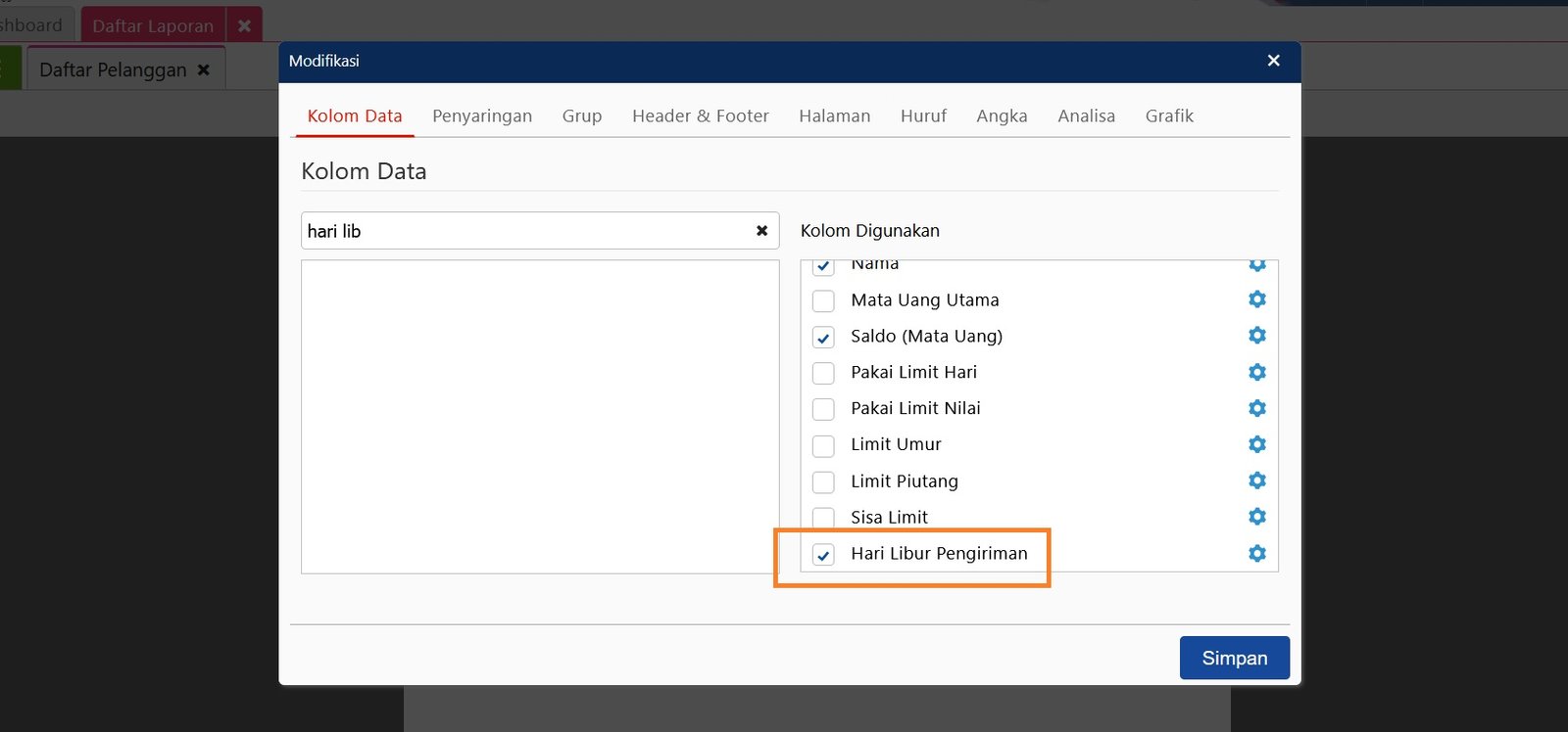Untuk menampilkan informasi atribut tambahan pada Laporan, maka perlu melakukan modifikasi pada laporan tersebut. Misalnya pada Laporan Daftar Pelanggan, buka laporan tersebut lalu ke menu ‘Modifikasi‘, cari nama atribut tambahan tersebut pada Kolom Data lalu klik 2x pada nama atribut tambahan untuk bisa ditampilkan pada Kolom Digunakan kemudian simpan.