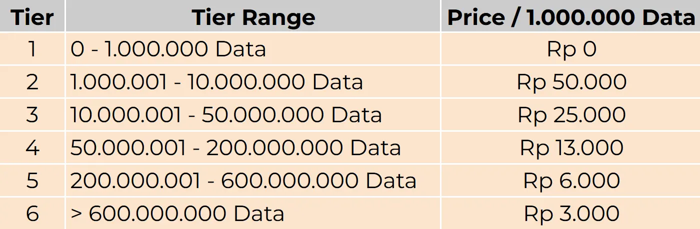 Pada level tertinggi ini, biaya per 1.000.000 data adalah Rp 3.000, ditambah perhitungan biaya dari tier sebelumnya.