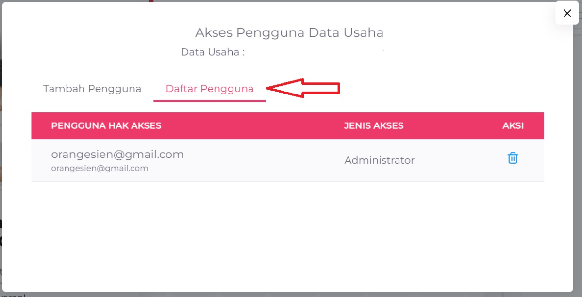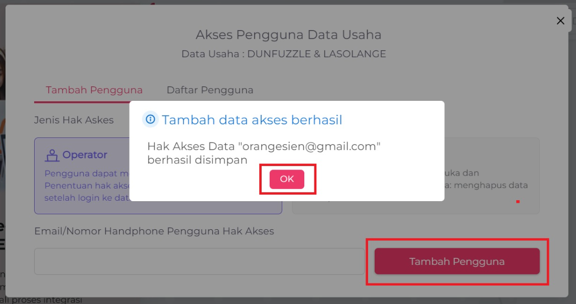 Isi kolom Email/Nomor Handphone Pengguna Hak Akses dengan data pengguna yang akan diberikan akses, lalu klik Tambah Pengguna.