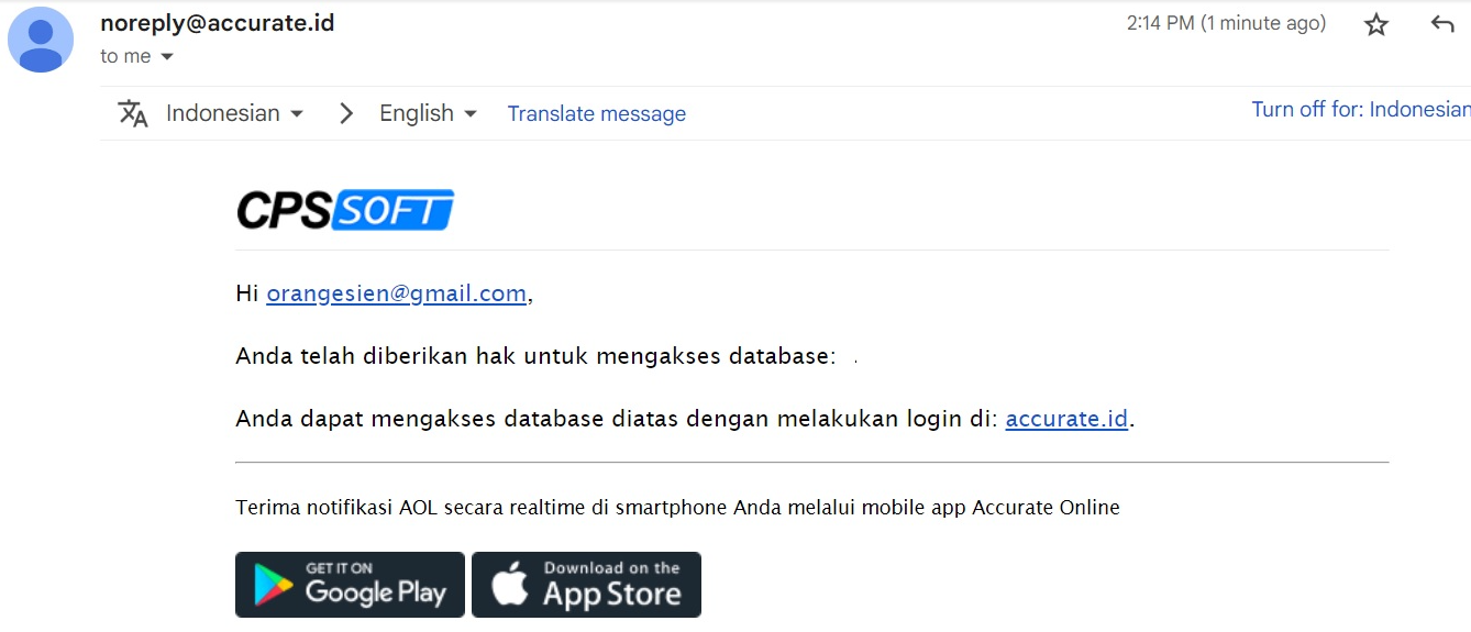 - Jika pengguna sudah terdaftar di accurate.id, mereka akan menerima email notifikasi untuk mengakses database.