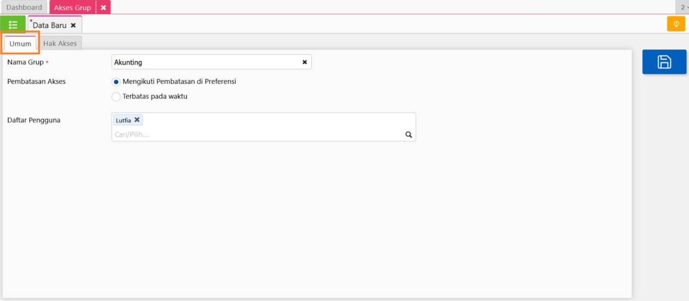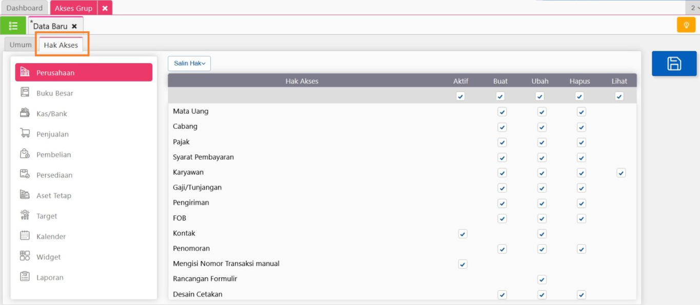 - Hak Akses: Di sini, Anda dapat menentukan secara spesifik fitur atau data apa saja yang dapat diakses oleh anggota grup. Hak akses ini mencakup izin untuk melihat, menambahkan, mengedit, hingga menghapus data tertentu sesuai kebutuhan.