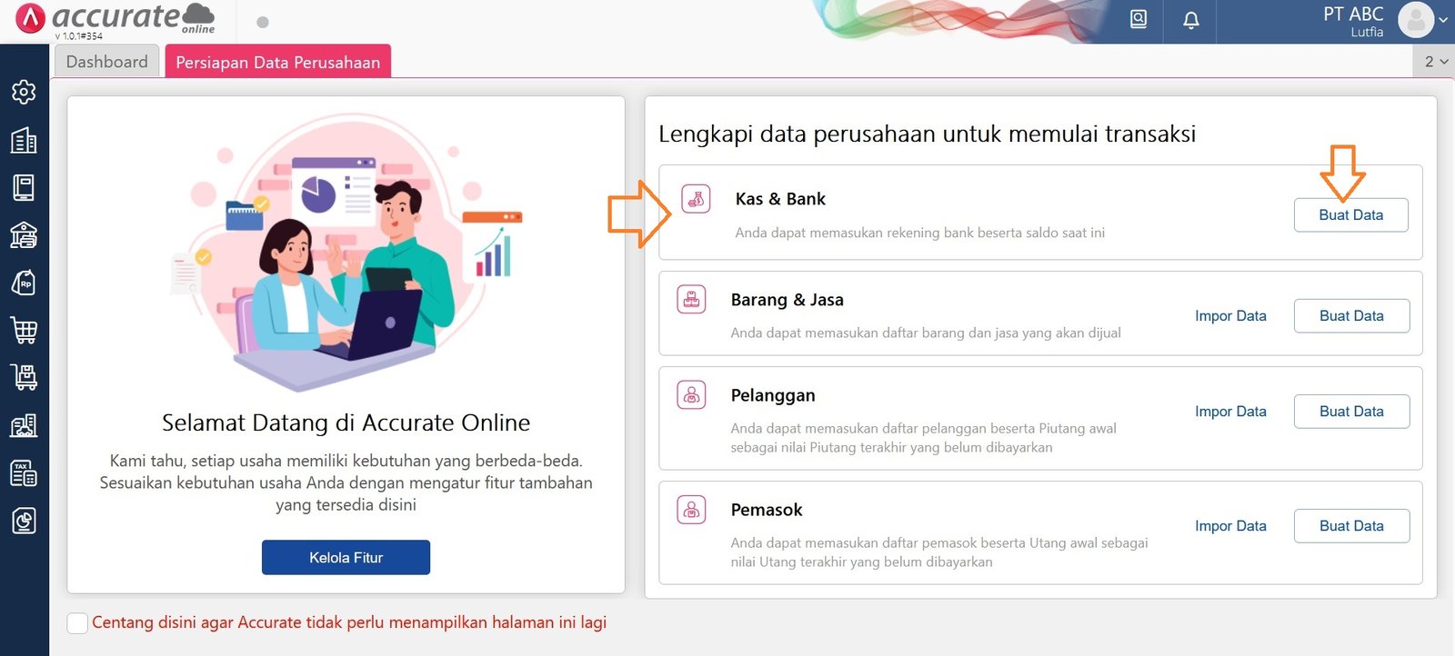 Pada halaman Persiapan Data Perusahaan yaitu dibagian lengkapi data perusahaan, klik ‘Buat’ pada bagian Kas & Bank.