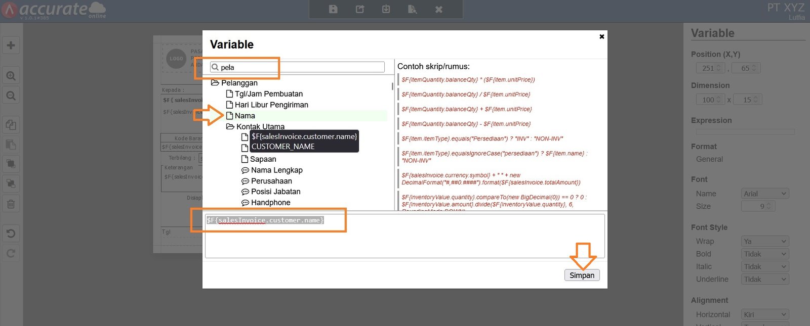7. Untuk penambahan Variabel Skrip silakan cari nama variabel skrip yang sesuai pada kolom pencarian, misalnya Nama Pelanggan.