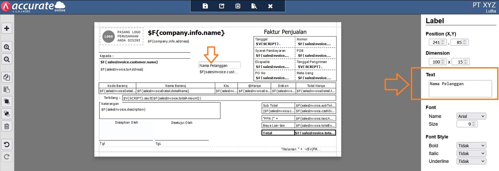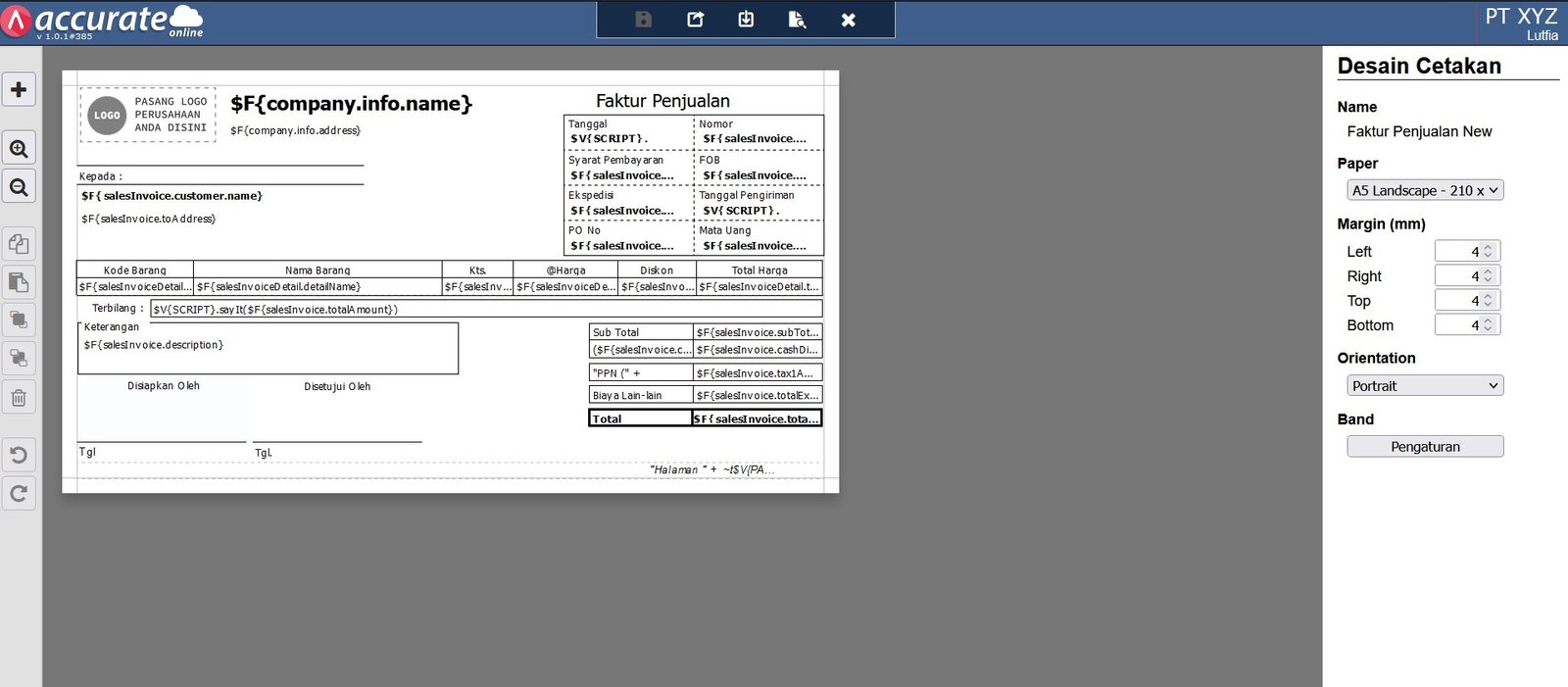 Fitur ini berfungsi untuk membuat desain cetakan dari formulir transaksi yang terdapat di data usaha Accurate Online, seperti Faktur Penjualan, Pesanan Pembelian, Pemindahan Barang, dsbnya. Yang bisa digunakan oleh pihak ke-3 sebagai bukti atau dokumen transaksi. Setiap formulir transaksi sudah dibuatkan Desain Cetakannya oleh Accurate Online, namun Anda bisa membuat desain cetakan sesuai kebutuhan dari bisnis/usaha Anda.