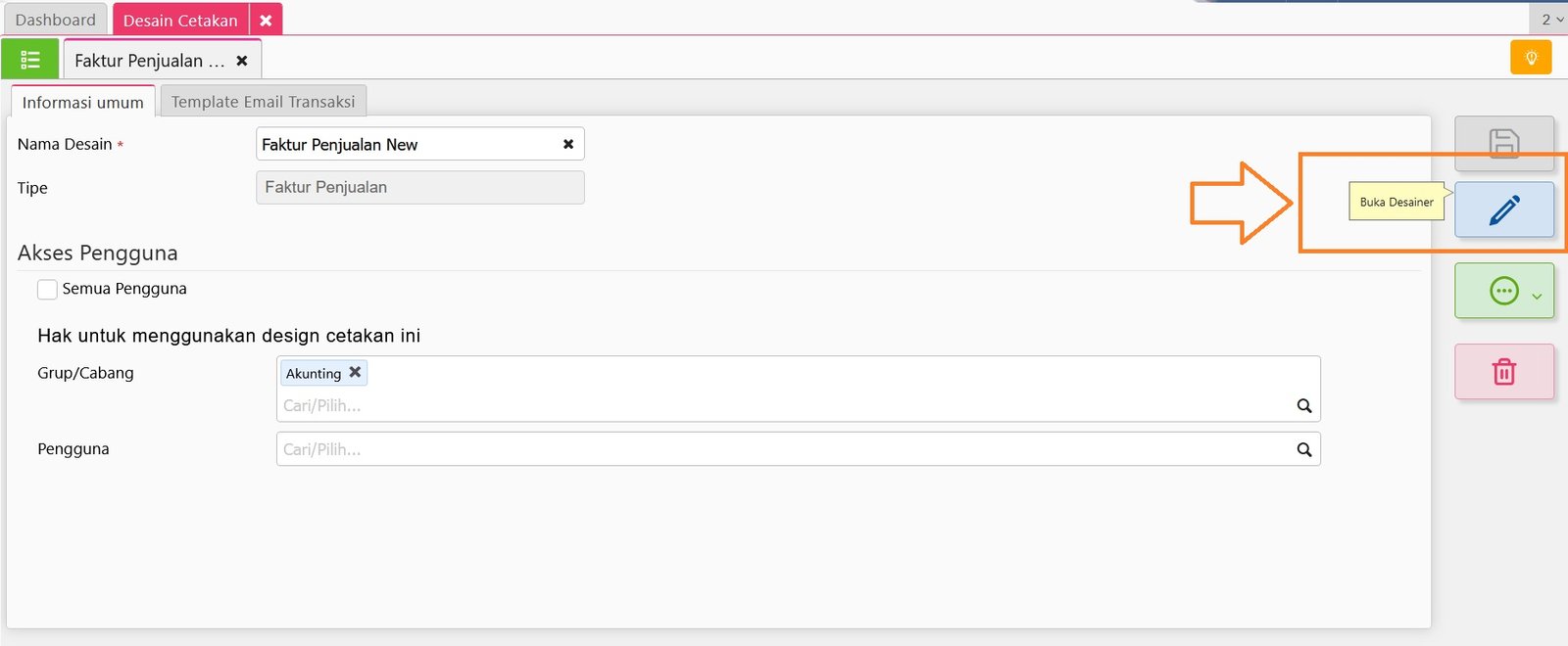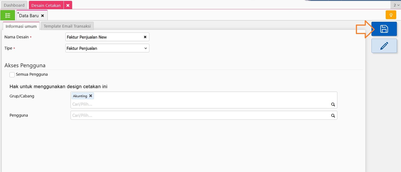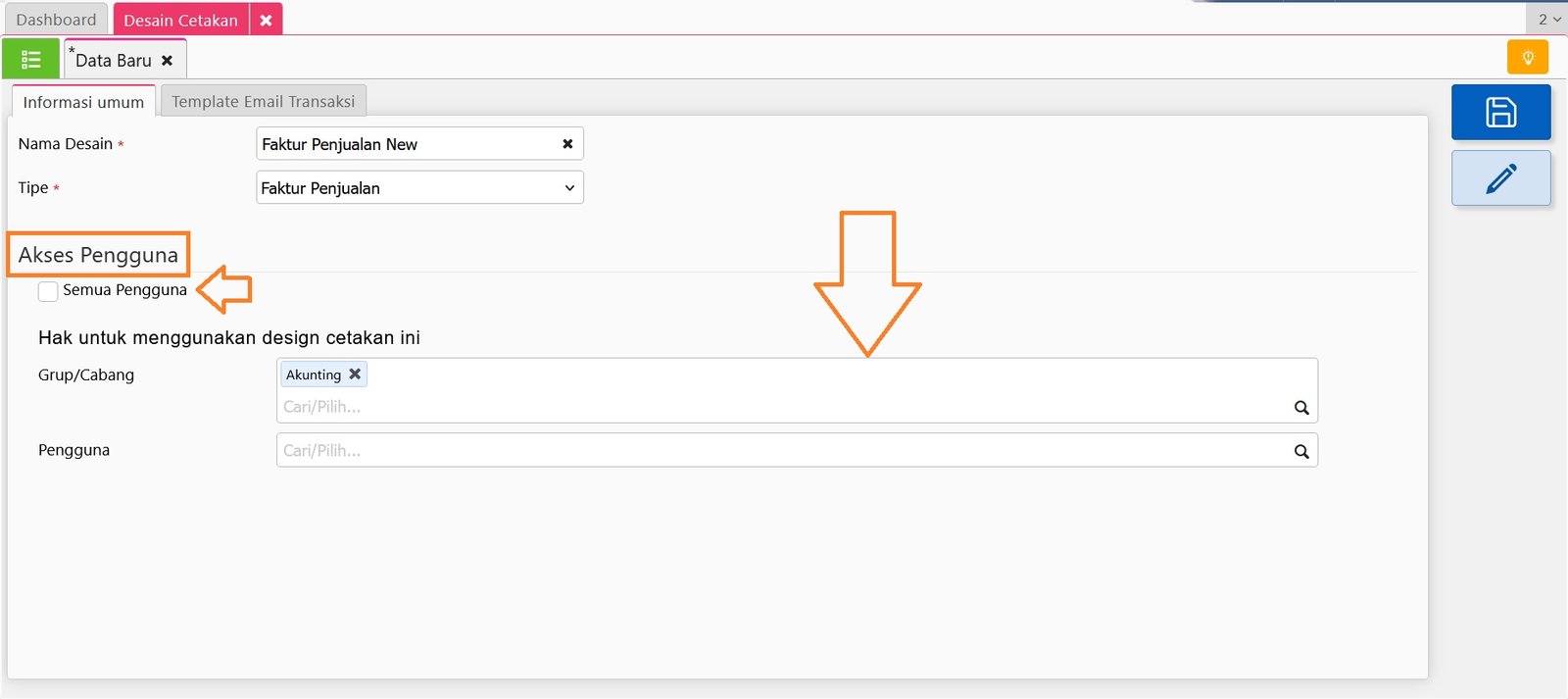 3. Selanjutnya tentukan ‘Akses Pengguna’ yang akan diberi akses untuk bisa menggunakan Desain Cetakan tersebut dengan melepaskan centangan pada informasi ‘Semua Pengguna’ dan tentukan Akses Grup/Cabang atau Nama Pengguna-nya.