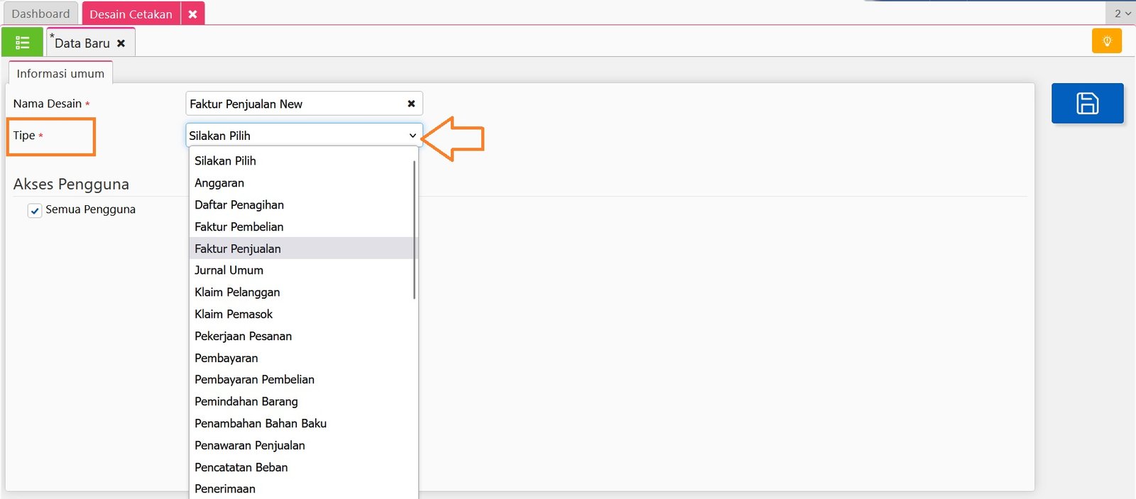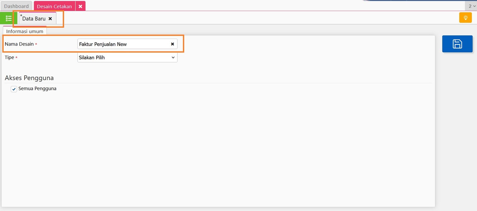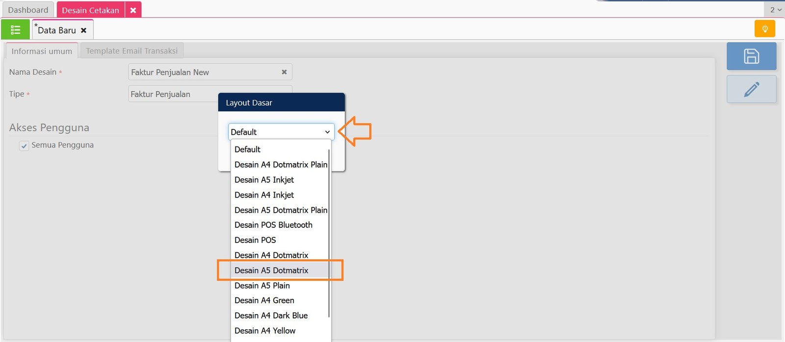 3. Selanjutnya tentukan ‘Akses Pengguna’ yang akan diberi akses untuk bisa menggunakan Desain Cetakan tersebut dengan melepaskan centangan pada informasi ‘Semua Pengguna’ dan tentukan Akses Grup/Cabang atau Nama Pengguna-nya.
