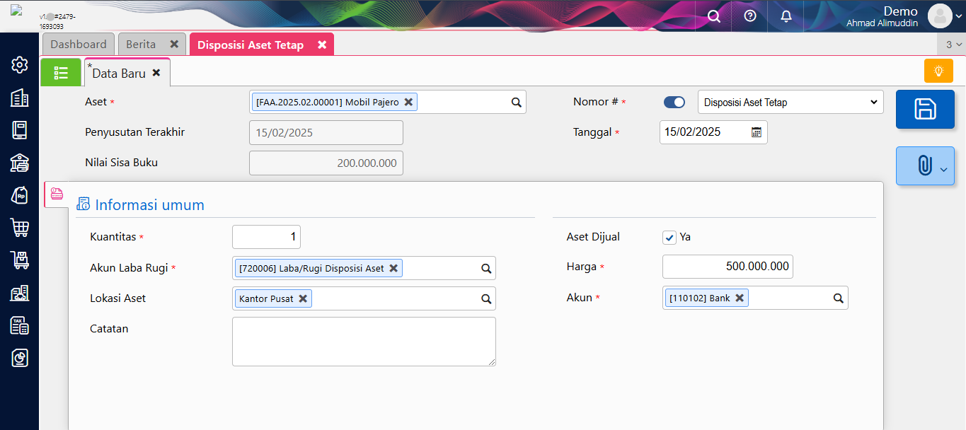 - Lengkapi informasi Aset, Tanggal, Kuantitas, dan Akun Laba Rugi atas disposisi aset tetap yang dilakukan. Kemudian centang Aset Dijual, tentukan Harga dan Akun penampung dana hasil penjualan aset tetap. Jika dijual secara tunai bisa langsung dipilih ke akun kas/bank.
