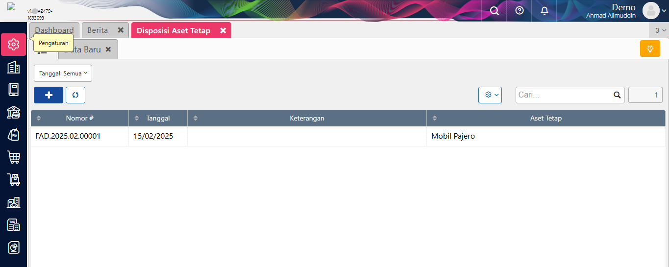 - Klik menu Aset Tetap | Disposisi Aset Tetap.