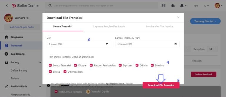 Masuk ke layanan penjual bukalapak yaitu https://seller.bukalapak.com/ kemudian klik pada ‘Transaksi’ lalu klik pada ‘Download File Transaksi’. Pilih rentang tanggal transaksi dan status transaksi yang akan diimpor kemudian klik ‘Download File Transaksi’.