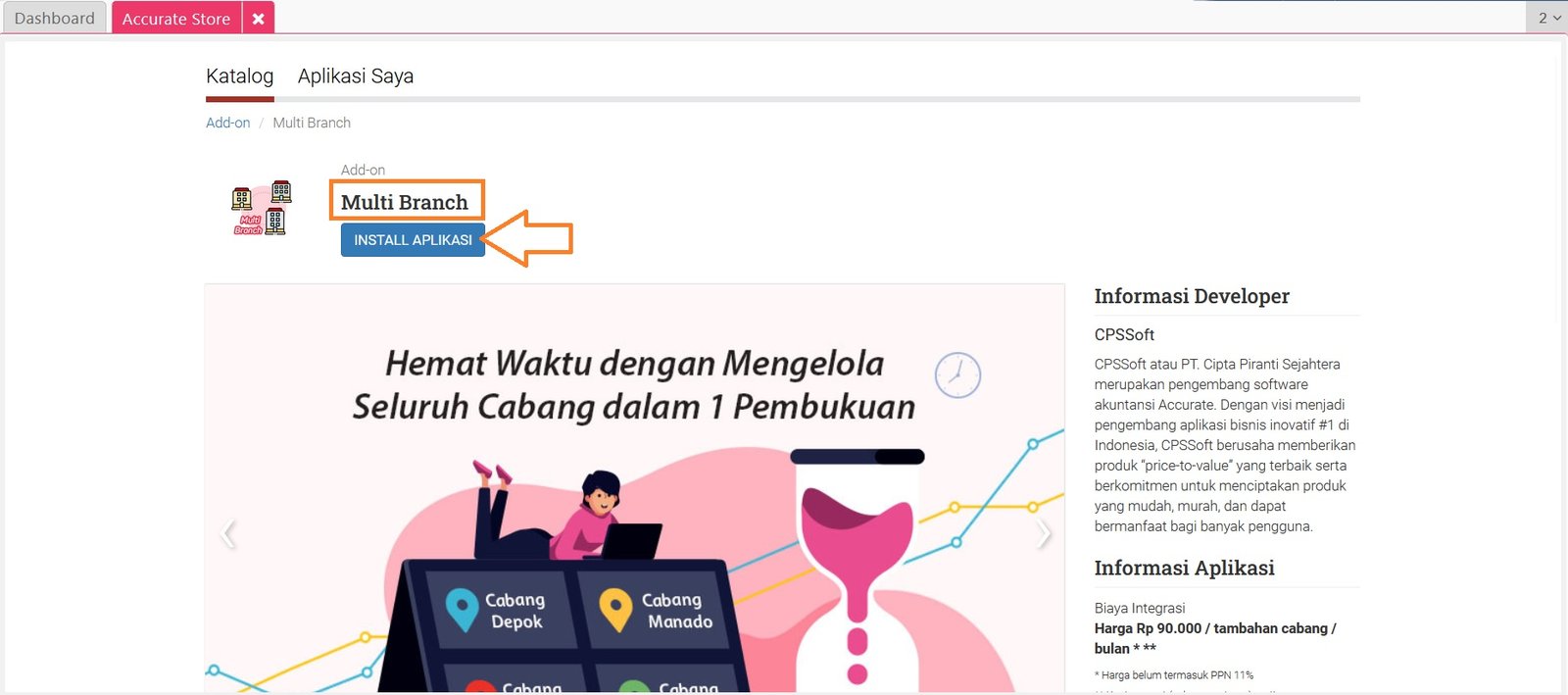 - Instal fitur tambahan Cabang pada Accurate Store melalui menu Pengaturan (cari multi branch).