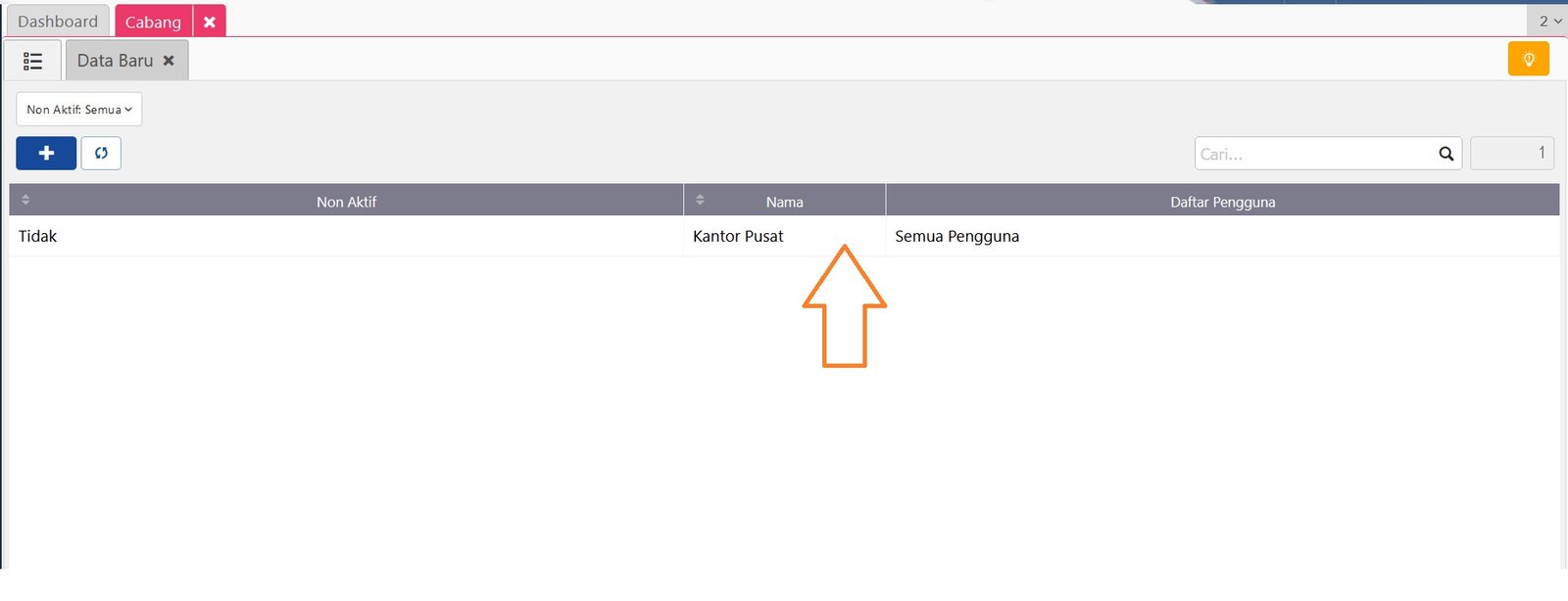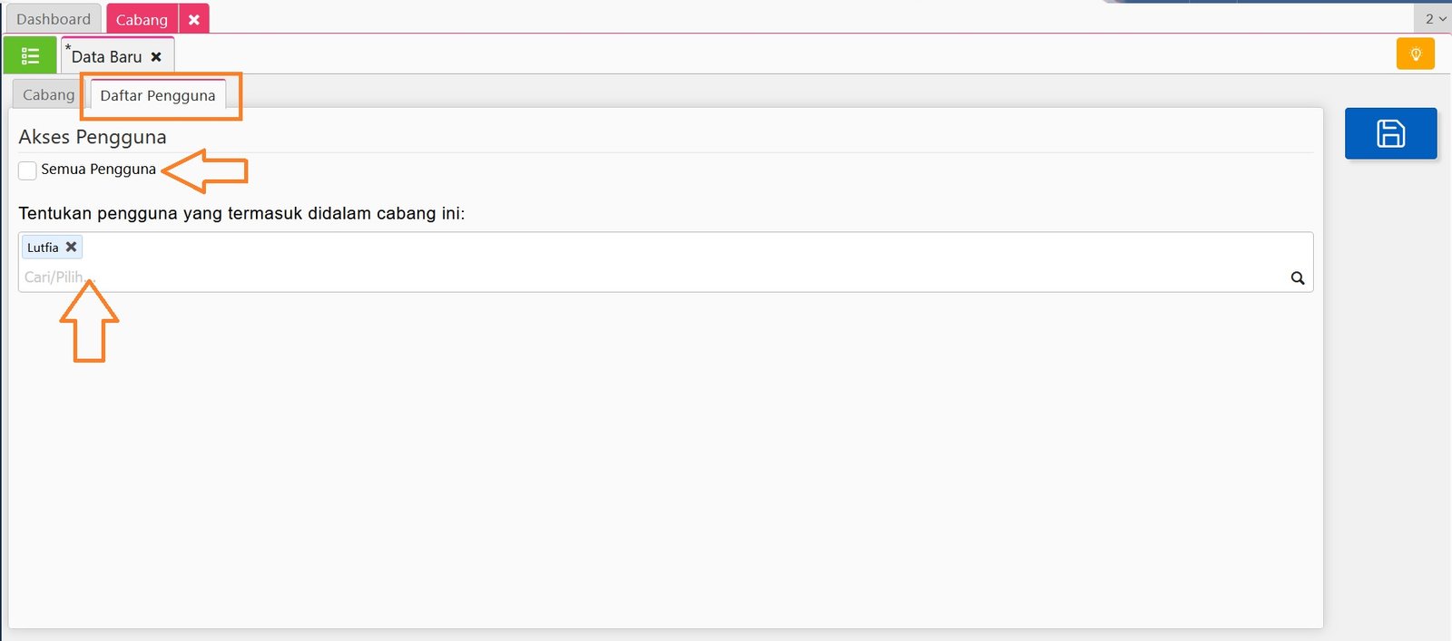 4. Selanjutnya Anda bisa mengatur akses pengguna ke cabang tersebut dengan melepaskan centangan pada ‘Semua Pengguna’ di tab ‘Daftar Pengguna’, lalu isikan pengguna yang bisa mengakses ke cabang tersebut.