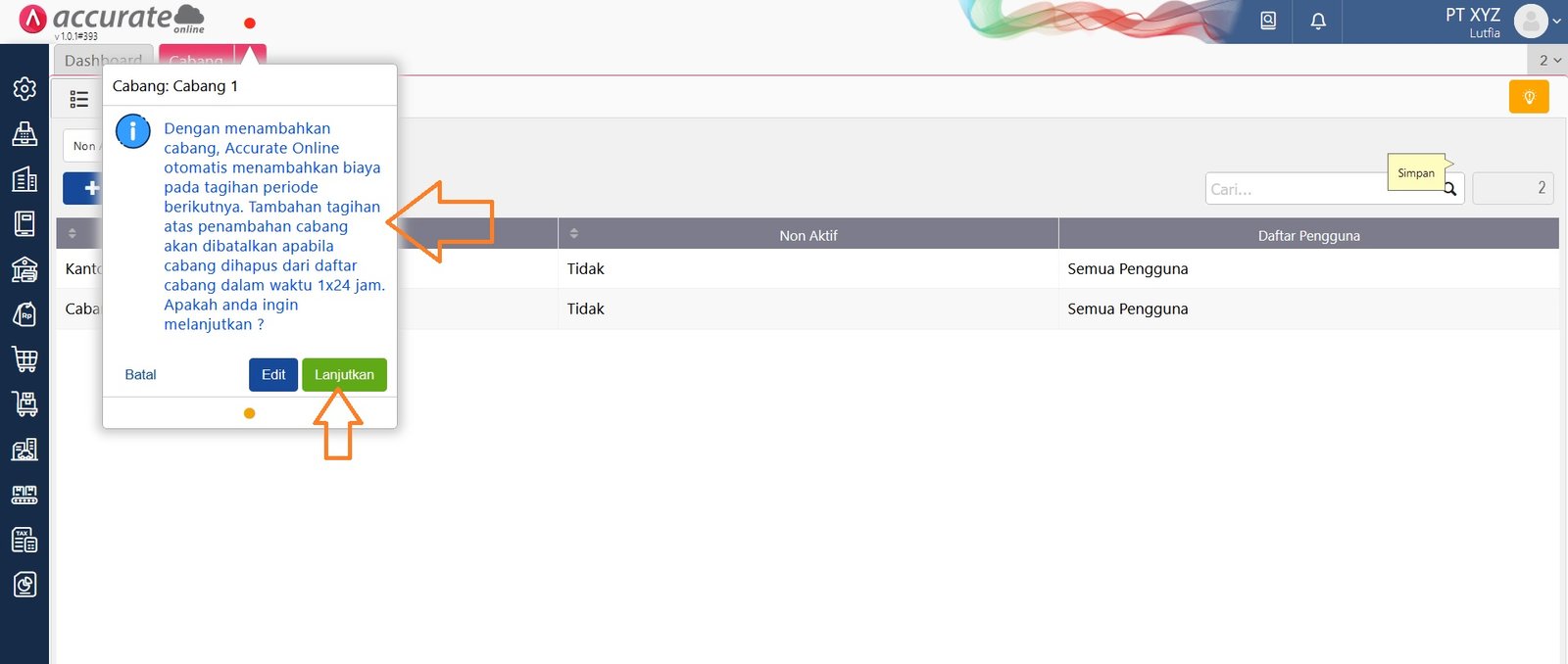 5. Simpan dan akan tampil pesan konfirmasi bahwa penambahan cabang baru akan dikenakan biaya, klik ‘Lanjutkan’ jika Anda menyetujui pengenaan biaya tambahan tersebut.