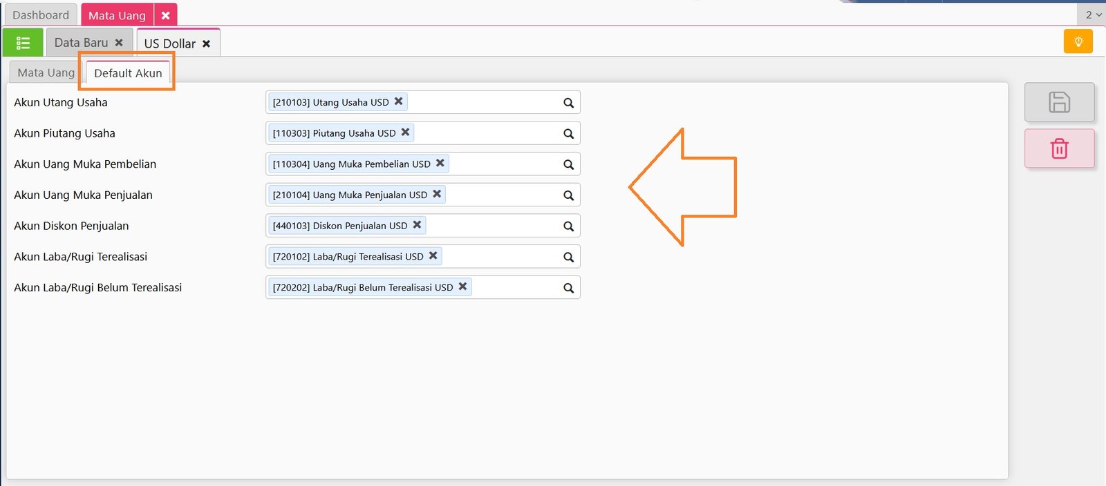 Akun-akun pada Default Akun akan digunakan sebagai akun yang akan dijurnal terkait transaksi dengan mata uang tersebut. Misalnya membuat Faktur Penjualan dengan mata uang USD, maka akun piutang akan merujuk ke default Akun tersebut, kecuali diatur berbeda pada Data Pelanggannya.