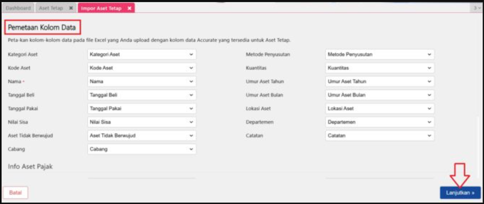 - Pada menu Pemetaan Kolom Data, petakan pada masing-masing kolom data yang tersedia. Jika file excel sudah sesuai dengan format yang tersedia maka kolom-kolom data akan terpetakan secara otomatis. Klik ‘Lanjutkan’ untuk melanjutkan proses impor aset tetap.