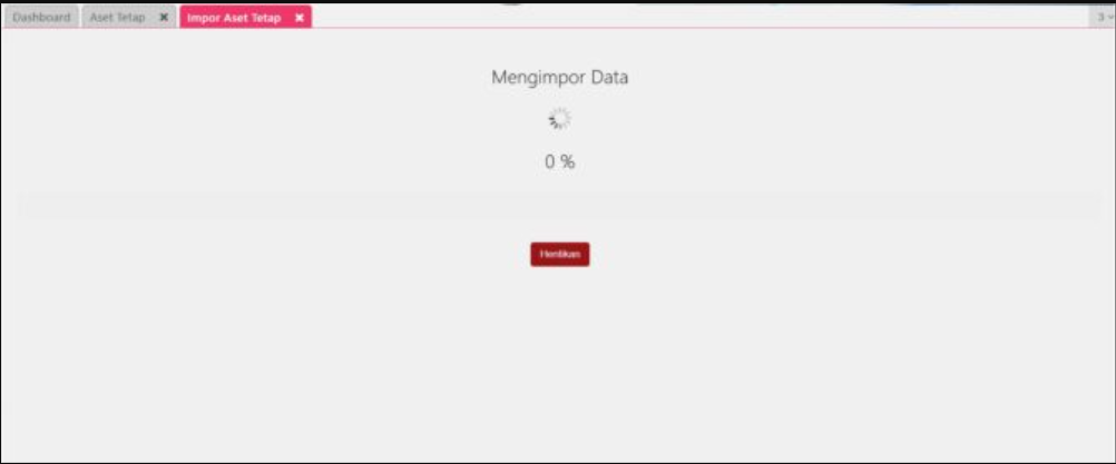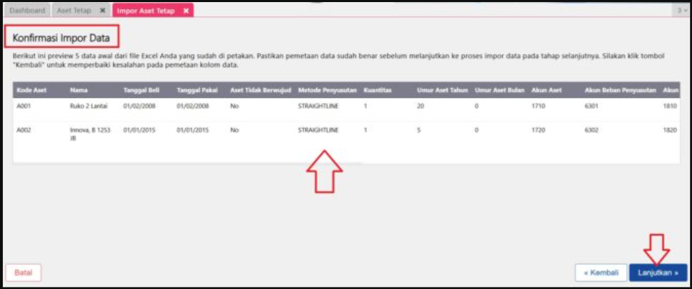 - Selanjutnya akan tampil menu Konfirmasi Impor Data yang berisi data-data Aset Tetap yang akan diimpor sesuai dengan data file. Jika data yang akan diimpor telah sesuai, klik ‘Lanjutkan’ untuk memulai proses impor data.