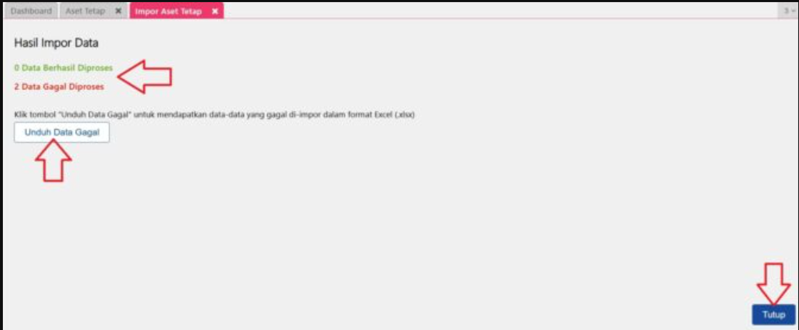 - Klik Impor Data lalu pilih Impor dari Excel kemudian akan tampil menu Impor Aset Tetap.