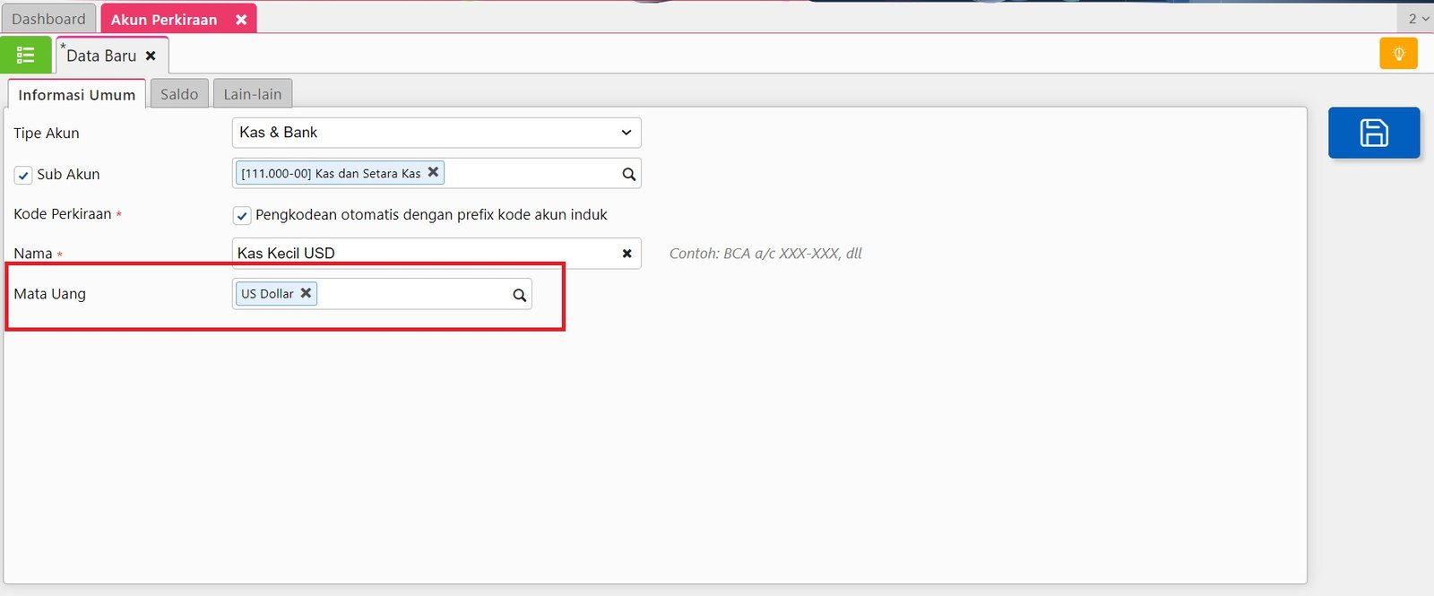 5. Lanjut ke tab Lain-lain lalu simpan akun perkiraan mata uang asing tersebut.