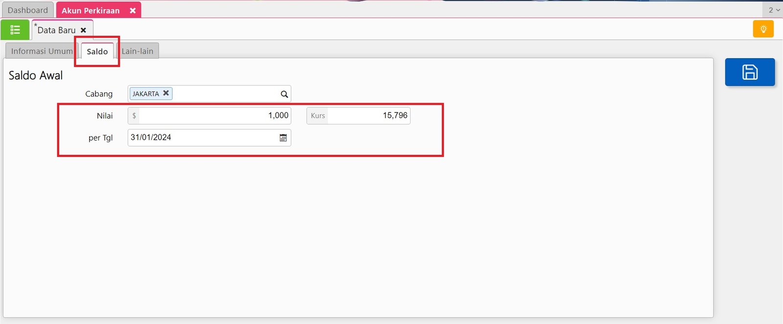 4. Pada tab Saldo, isikan Nilai Saldo Akun tersebut dalam mata uang asing tersebut dan isikan rate transaksi per tanggal Saldo Awal.