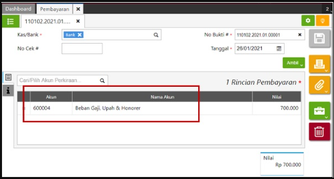- Pastikan sudah melakukan pencatatan pengeluaran terkait biaya produksi tersebut, yaitu misalnya Biaya Produksi seperti rincian digambar berikut ini, dilakukan pencatatan melalui formulir Pembayaran di menu Kas/Bank, sebesar Rp 700.000 dimana sebesar Rp 350.000 merupakan biaya terkait proses produksi yang berlangsung.