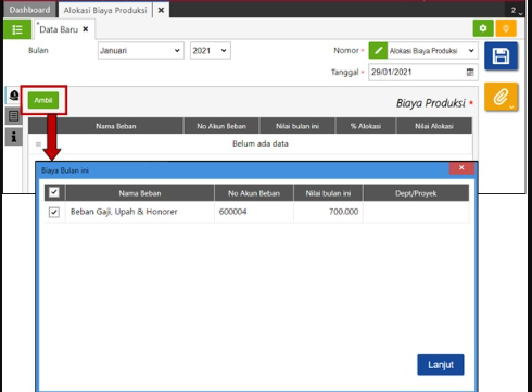 - Kemudian klik ‘Ambil’ dan pilih biaya produksi yang dimaksud (catatan : nilai biaya akan tampil jika digunakan dalam proses produksi di periode tanggal alokasi biaya produksi tersebut). Lalu klik ‘Lanjut’.