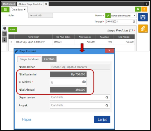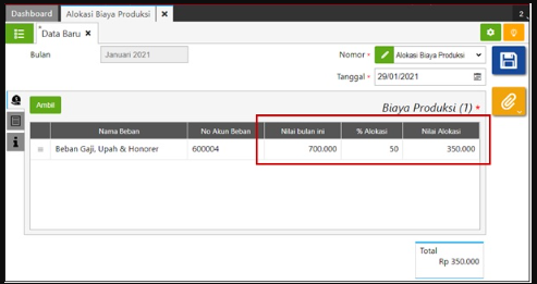 - Isikan % Alokasi atas biaya tersebut yang dialokasikan ke proses produksi periode tersebut.