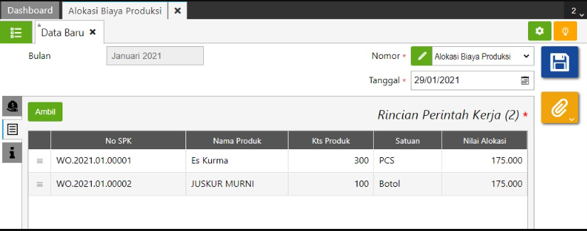 - Selanjutnya klik tab ‘Rincian Perintah Kerja’, lalu pilih nomor Perintah kerja yang akan dialokasikan nilai biaya produksi tersebut, dan nilai biaya produksi akan dibagi secara proposional sesuai nilai Standar Biaya Produksi dari masing-masing WO.