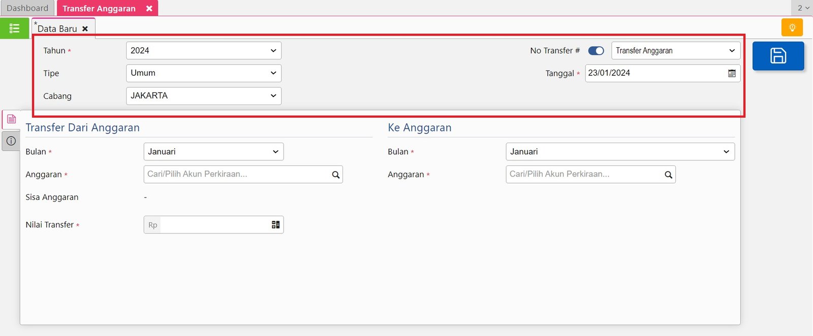 2. Lengkapi informasi Tahun, Tipe, Cabang dan Transfer Anggaran sesuai kebutuhan.