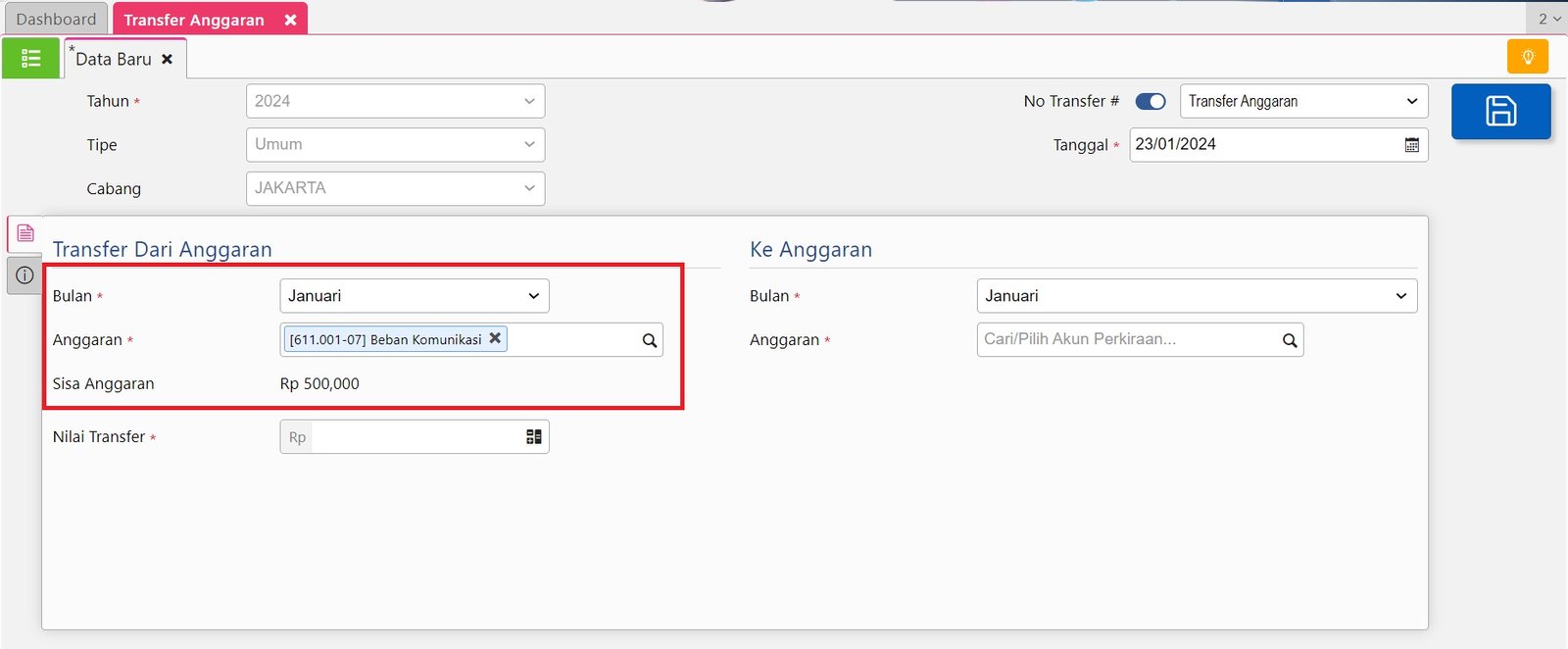 3. Isikan Bulan dan Anggaran pada bagian Transfer Dari Anggaran dengan informasi Bulan serta Anggaran yang akan ditransfer nilai anggarannya yaitu bulan Januari 2024 dengan Anggaran Beban Komunikasi. Catatan : nilai pada sisa anggaran akan otomatis ditampilkan dengan nilai sisa anggaran di bulan yang terpilih untuk anggaran yang terpilih.