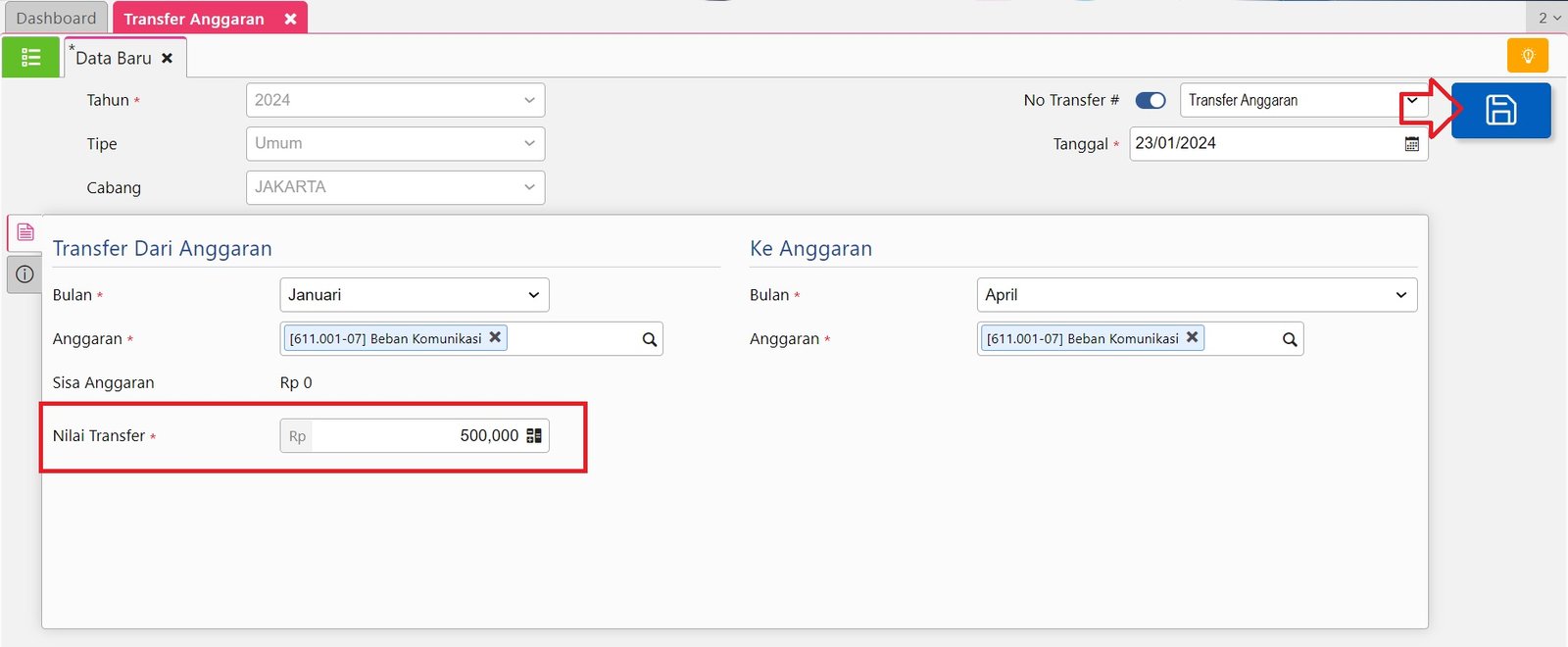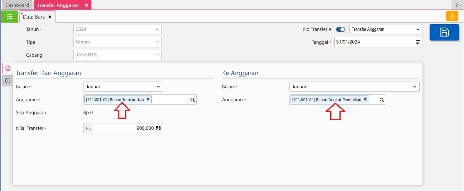 Catatan : Transfer Anggaran juga bisa melakukan transfer antar Anggaran. Sebagai ilustrasi, Anggaran Beban Transportasi pada bulan Januari 2024 sebesar Rp 900.000 akan dipindahkan ke Anggaran Beban Angkut Pembelian dibulan yang sama yaitu Januari 2024.