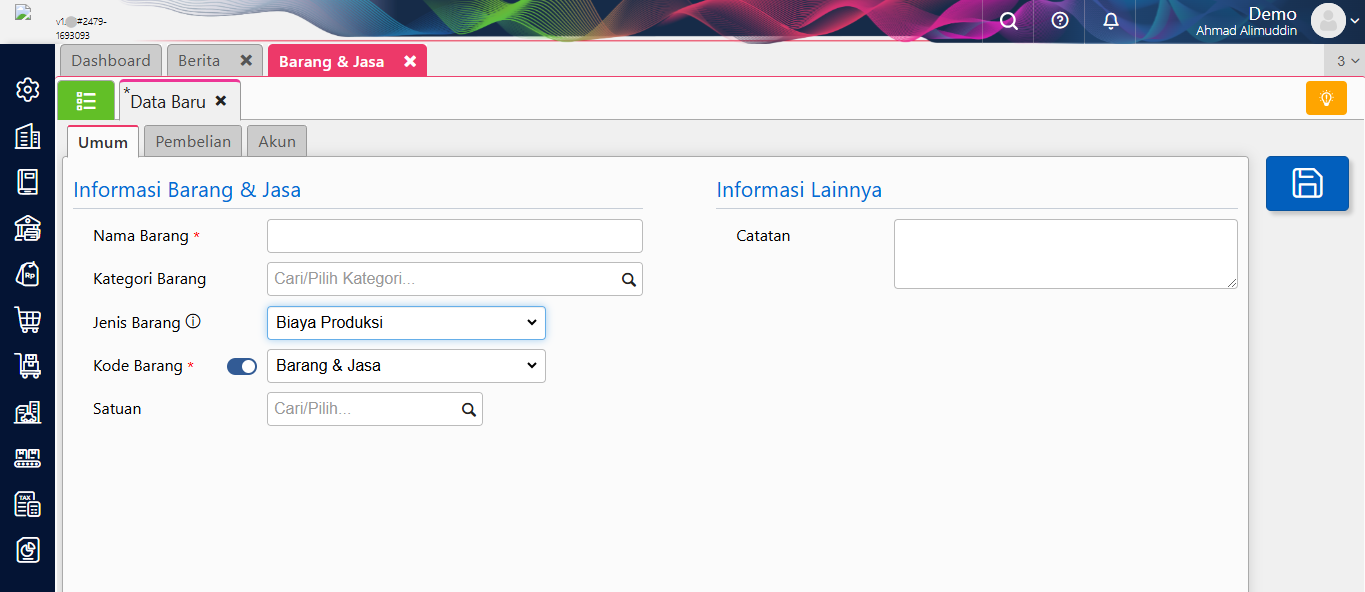 - Bahan Baku : dicentang pilihan ini jika barang tersebut bisa digunakan sebagai bahan baku dalam proses produksi. Sehingga nama barang tersebut akan tampil dalam pencarian di Formula Produksi di bagian Bahan Baku/Barang dan dalam pembuatan Nilai Standar Biaya Produksi.