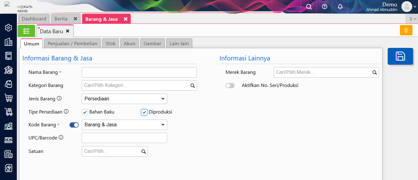 - Bahan Baku : dicentang pilihan ini jika barang tersebut bisa digunakan sebagai bahan baku dalam proses produksi. Sehingga nama barang tersebut akan tampil dalam pencarian di Formula Produksi di bagian Bahan Baku/Barang dan dalam pembuatan Nilai Standar Biaya Produksi.