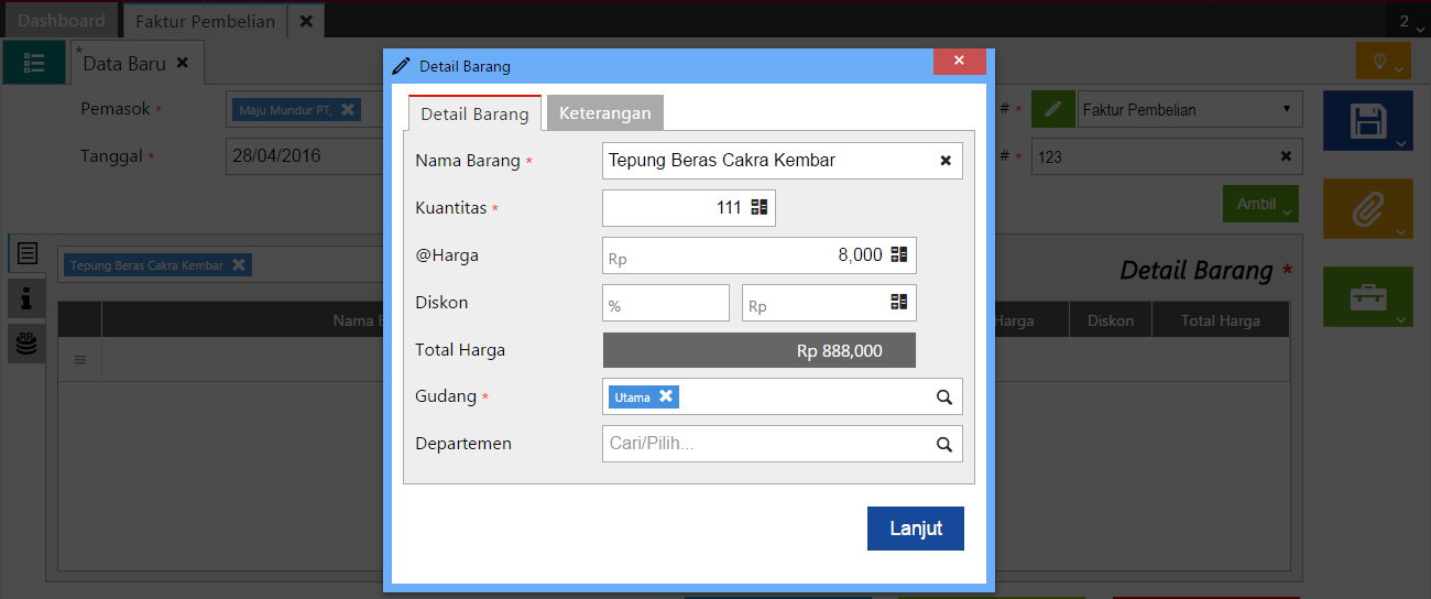 - Tentukan informasi detail atas barang yang dibeli, lalu klik Lanjut.