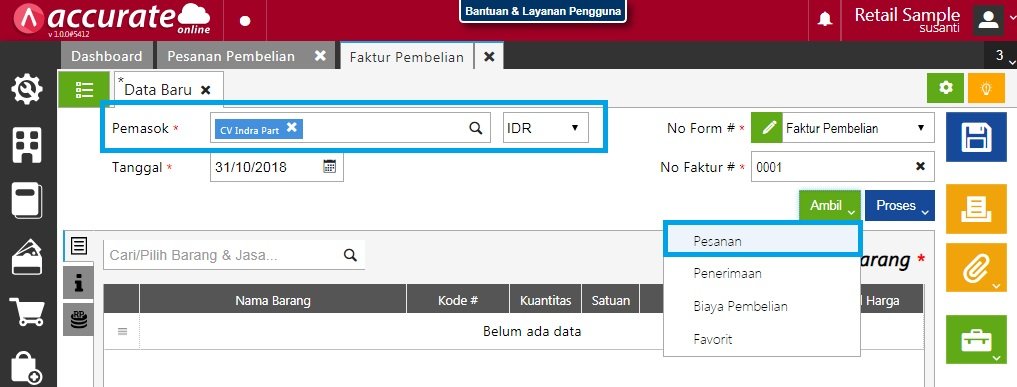 - Buatlah faktur pembelian dari menu Pembelian | Faktur Pembelian. Lalu masukan nama pemasok yang pesanannya akan difakturkan dan klik Ambil | Pesanan.