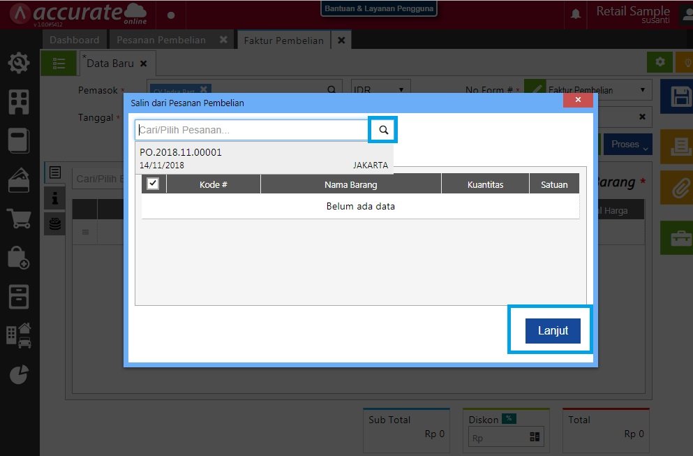 - Pilih faktur pembelian yang tadi sudah dibuat di awal, kemudian klik Lanjut.