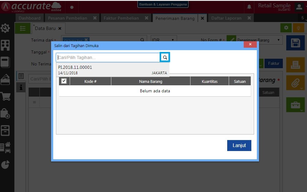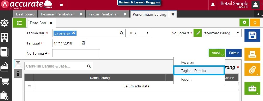 - Selanjutnya untuk melakukan proses , Anda dapat membuat penerimaan barang dari menu Pembelian | Penerimaan Barang, lalu klik Ambil | Tagihan dimuka.