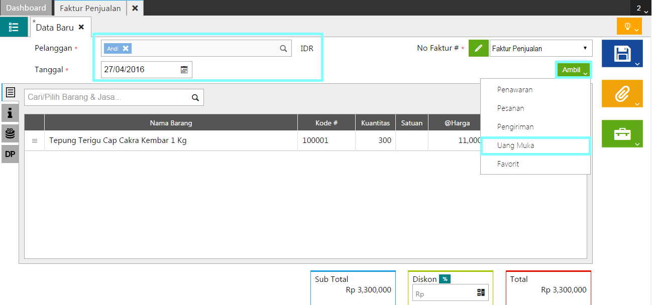 1. Lengkapi informasi Nama Pelanggan yang sudah memberikan uang muka, dan masukan barang yang dibeli. Kemudian klik Ambil lalu pilih Uang Muka.