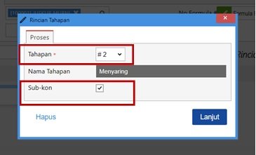 - Kemudian isikan tahapan produksi atas proses produksi dari produk tersebut jika ada dan isikan nomor urut tahapannya pada kolom ‘Tahapan’. Dan jika tahapan tersebut dialihkan pembuatannya ke pihak ketiga, maka centang ‘Sub kon’.