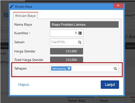 - Kemudian ke tab Biaya dan isikan biaya-biaya produksi yang dikeluarkan terkait produksi atas produk tersebut. Jika ada tahapan produksi yang di subkon, maka anda bisa mengisikan ke biaya yang terkait.