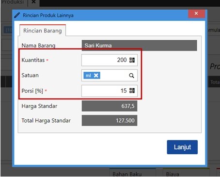 - Lalu ke tab Produk Lainnya, isikan produk lainnya derta jumlah barang yang diproduksi dan porsi harga standar-nya.