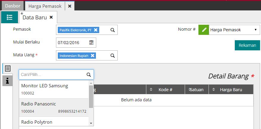 2. Lengkapi field Nama Pemasok, Mulai Berlaku dan Mata Uang. Kemudian pada bagian Cari/Pilih, masukan nama barang yang akan dimasukan daftar harganya.