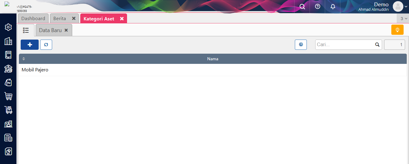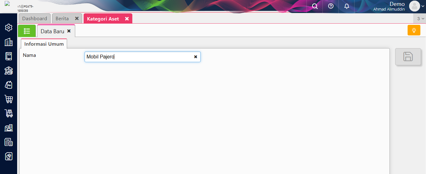 - Tentukan Kategori Aset yang Anda buat pada field Nama, lalu klik Simpan.