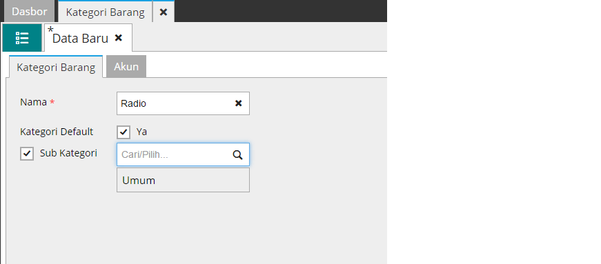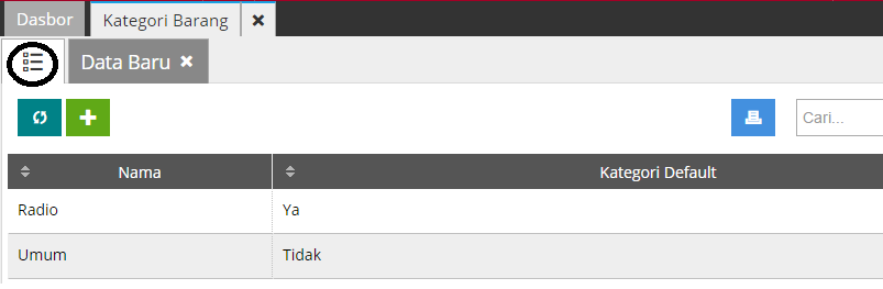 - Untuk melihat daftar kategori barang yang telah Anda buat klik tombol yang diberi tanda lingkaran.